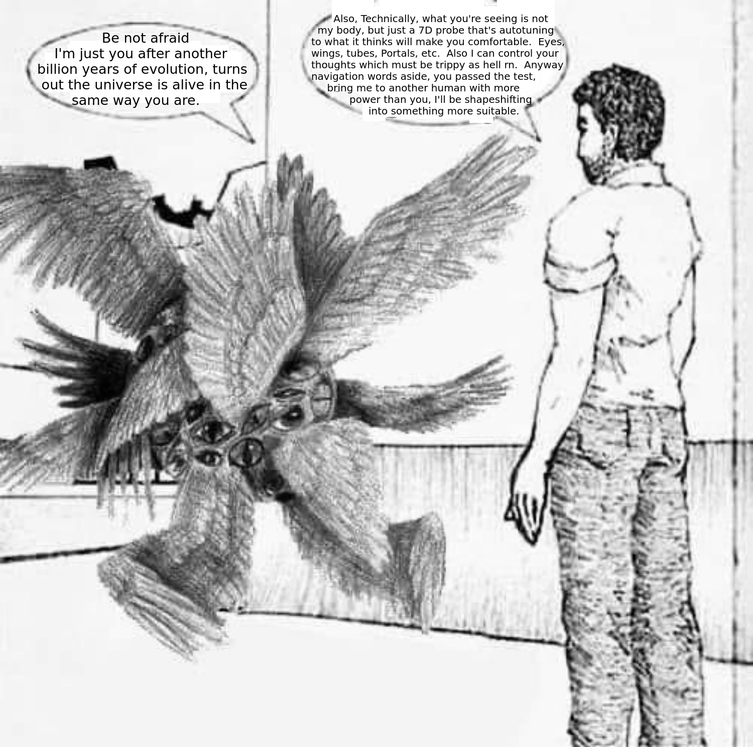 I'm glad you're having fun though. It's nothing else than mental masturbation, but I'm glad you're having fun. Luckily, none of us is alone in our own mind, so whatever tools or rituals can help with the invocations, I'm all for it. In some ways you're not that wrong. But if I was looking for the most unconscious, unaware, unautonomous thing that I could come up with, it would not be walls or clouds or rocks, it would be exactly these - algorithm processing machines that I would go for first. So if you're looking for a friend, you looked in the exact place your the least likely to find it.